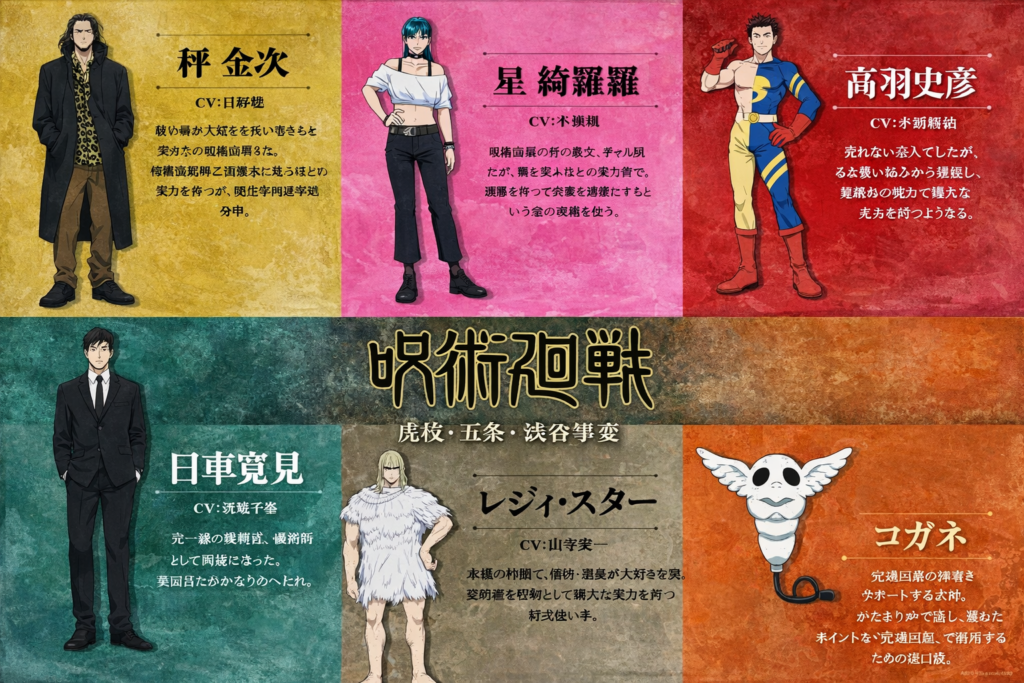 この記事では、虎杖悠仁や伏黒恵ら主要キャラクターに加え、死滅回游編で初登場する新キャラまで、登場術師をわかりやすくまとめています。これから視聴する人や原作未読の人にも役立つキャラ紹介ガイドです。
